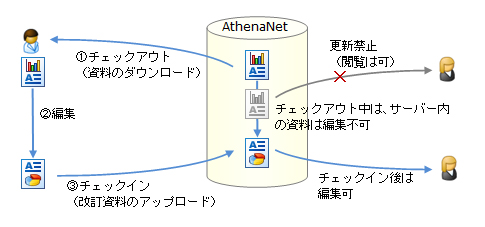 同一のファイルを複数のユーザーが編集する場合には、サーバーに格納されているファイルの編集を禁止する必要があります。AthenaNetは、チェックイン・チェックアウト機能によりファイルの編集をサポートします。