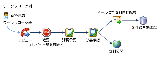本機能を活用することにより、例えば、資料のレビュー依頼やレビュー結果の確認、承認手続き、関係部署への資料配布等の一連の業務プロセスを効率的、且つ、確実に行うことができます。