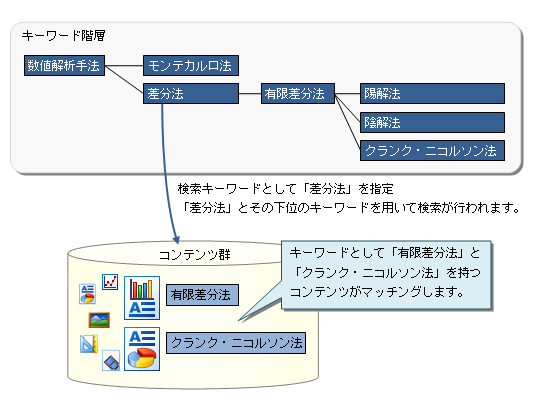 を併せて登録することができます。キーワード検索とは、このキーワードを用いてコンテンツを検索します。また、キーワードは、抽象的な意味から具体的な意味、もしくは、広義から狭義となるように階層的に構築することにより、全文検索と同様に、キーワード階層を活用した曖昧検索が可能になります。これにより、検索キーワードが良く分からない場合でも、コンテンツの絞り込み検索が可能になります。