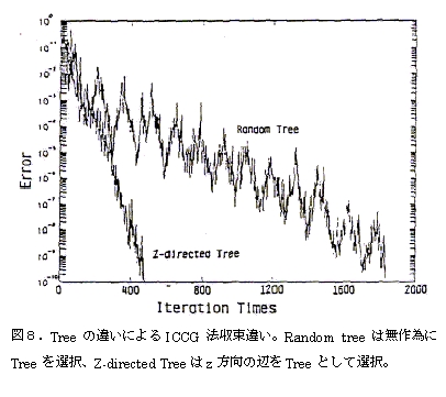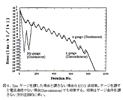 まず、ICCG法は辺要素法で特有な不定の方程式が解けます。開発当初、不定方程式が解けるはずが無いと考え、木構造によるゲージを課し不定性を無くしていました。ただ、解けることは解けるのですが、極端に収束の遅いものでした。ゲージ条件をはずしますと、不完全コレスキー分解でゼロ割が起こりました。やむをえず、いろいろ調べましたが、Treeゲージの取り方により、少しは収束は良くなるのですが、それでも収束は非常に遅いものでした(図8)。ところが、岡山大学ではゲージ条件無しで高速に解いておられました。岡山大藤原氏(当時,現同志社大)に相談したところ、行列の対角成分に1より少し大きい数(確か1.02でした。加速ファクタと呼ばれています)を掛けられていることに気がつきました。これを試してみると、なんとすかすか解けてしまいます(図9)。その後、藤原氏は、加速ファクタについて詳細に調べられ、その最適値を求める方法を考えられています[27]。