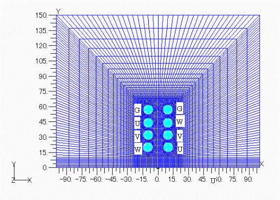 架線は直線として断面の二次元解析を行います。三相導体(U、V、W)と接地電位導体(G)がFig1の様に配置されているとします。三相の電線には実効50kVの交流電圧が加わるとします。y=0は地表面とし、電位ゼロとします。また、他の外境界も電位ゼロと仮定します。導体周りのメッシュはFig2の様にしています。導体表面に対して面要素(二次元の場合は線要素)を定義し、電位を与えます。