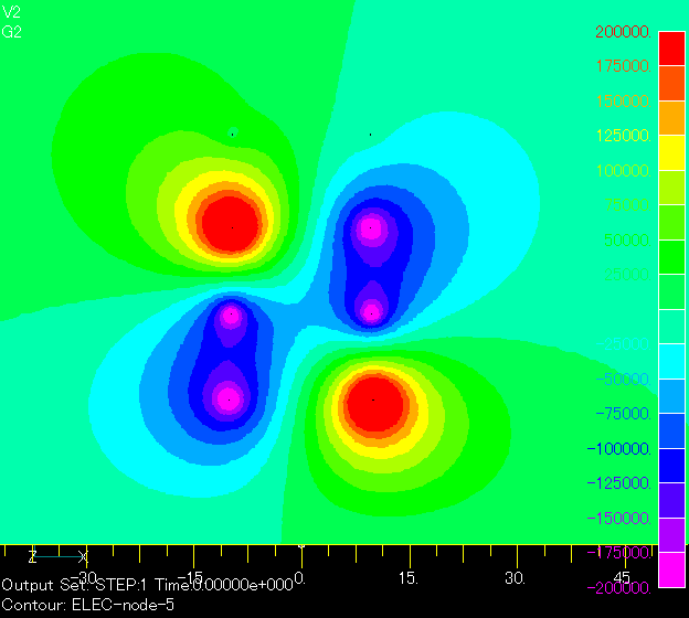 ここでは、簡単な計算例により、静電場解析機能についてご紹介します。 まず、気中送電線の電場解析例を示します。