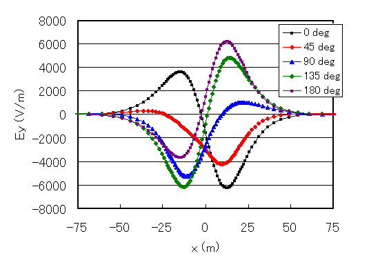 Fig3とFig4に、気中における電位ポテンシャルの分布と地表面の電界強度を示します。地表面は電位ゼロの等ポテンシャル面になっており、地表面に直交する電場のみとなります。