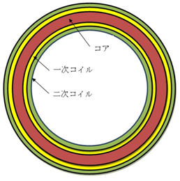文献[1]を参考に,Fig.1に示す,リング試料に一次,二次コイルを巻きつけたトロイダルコイルを用いて解析します。 材質はSUS430のバルク試料とし,試料中の平均磁束密度が5mTとなるように電圧を決定し,100Hz,1kHz,10kHzの交流電圧を印加します。 計算領域は角度方向0.5度,上下方向1/2としています。複素比透磁率は文献[1]を参考に設定しました。 100Hz,1kHzまでは $\mu^{\prime} > \mu^{\prime\prime}$ですが,10kHzでは$\mu^{\prime\prime}$値がピークを越えて逆に$\mu^{\prime} < \mu^{\prime\prime}$となっています。 参考までに,実部のみで100Hzの電圧を印加した場合の結果も併せて示します。