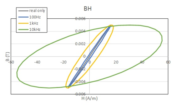 ここで,$n$はターン数,$S$は試料断面積,$l$は平均磁路長です。 100Hzでの複素透磁率の結果は電流の位相差分曲線がわずかに膨らむ程度ですが,1kHzではさらに膨らみ,10kHzでは大きく膨らんでいることがわかります。 磁気損失は先に説明しましたように,BHループ内の面積,もしくは(2)式より算出できます。 Table 1に上記に手法とEMSolution内部で算出した磁気損失を示します。 なお,(2)式で使用した$H_0$は(4)式で算出した$H$の振幅を使用しています。 よく一致していることが確認できます。