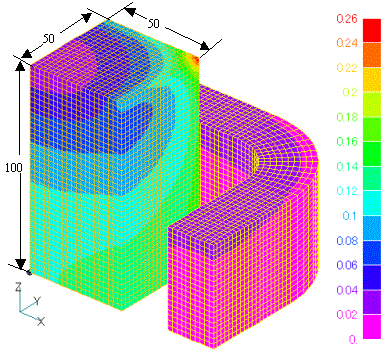 COILはメッシュに依存しないため利用しやすい機能です。軸対称の例は"COIL(外部電流磁場ソース)のインダクタンス計算"で紹介しておりますが、ここでは、3次元で磁性体を含むモデルを例に説明します。鉄芯部分をトータルポテンシャル領域、コイルと空気部分を変形ポテンシャル領域とする2ポテンシャル法(A-Ar法)と、全領域をトータルポテンシャルで解き表面定義電流ソースSDEFCOILでコイルを定義した場合(A法)を比較し、精度を検証します。