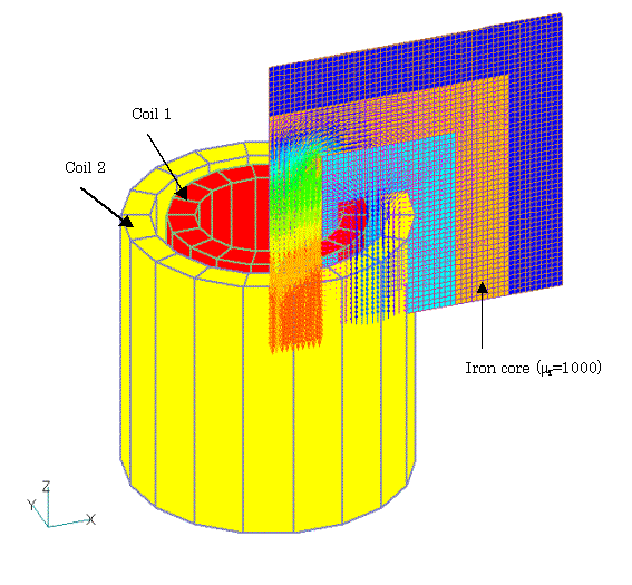 インダクタンスの計算はGCE、ARCおよびLOOPの要素に対して行われます。他の要素の自己および相互インダクタンスは計算されず0とおかれます。 GCE、ARCおよびLOOPと他の要素の間の相互インダクタンスも計算されます。 解析例として、Fig.1のような軸対称二次元、交流定常解析を考えます。鉄コアに2シリーズのLOOPコイルが巻かれており、Coil1に電圧を加え、Coil 2は短絡されているとします。