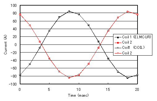 同じ解析をELMCUR(内部電流ソース)を使って解析した場合との比較をFig.2に示します。 ELMCURを使った場合、空心分のインダクタンスは解析領域に含まれます。ELMCURを使った場合とCOILを使用して空心のインダクタンスを内部で計算した結果は、Fig.2の通り一致しています。