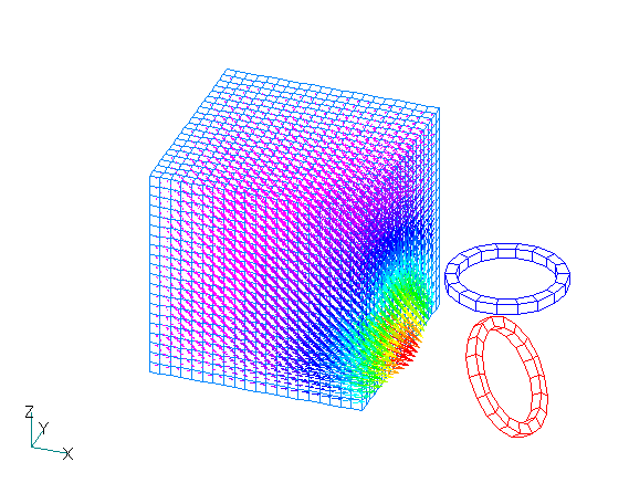 Fig.1では、円形コイル(LOOP)がy軸周りに回転しながらz方向に移動させた例を示します。青色の位置がコイル定義初期位置です。 解析は静磁場解析しか行っておりませんが、渦電流を含む過渡解析の場合でも同様にして運動を与えることができます。