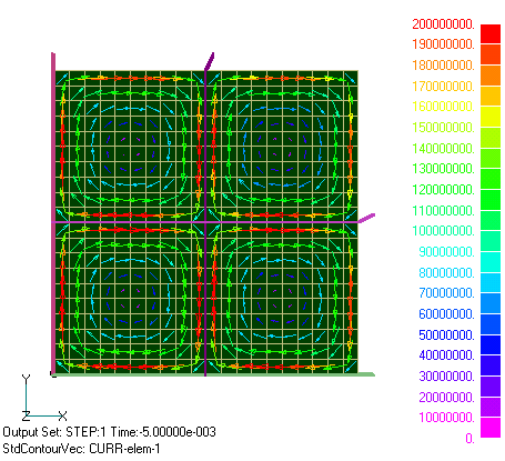 また、Fig.1のように交差するギャップ面を定義できるようになりました。 Fig.2,3に六面体要素メッシュで計算したときの渦電流密度分布を示します。絶縁ギャップが正常に模擬されています。周波数が低く、4つの渦に大きな差が有りませんが、若干外側の渦で密度が大きくなっています。Fig.4,5には、三角柱(プリズム)要素を用いた結果を示します。六面体の場合とほぼ同じ結果が得られています。四面体メッシュでも同様に使用することが出来ます。 ギャップ要素を使用する際、以下の注意点が挙げられます。
