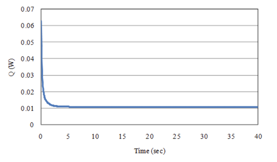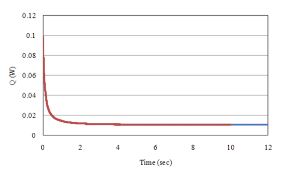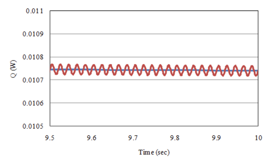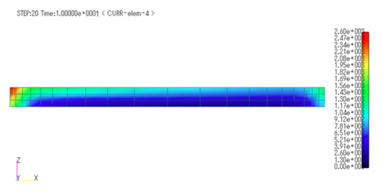 PHICOILで得られた結果を初期値として,SUFCURを用いてリスタート解析することができます。 本条件に適用し,20ステップ(0.1s)解析してみます。 Fig.5に渦電流損グラフを示します。 予想通り,渦電流損は一定値0.01069Wとなり、他の手法を用いた解析と一致します。 もちろん導体断面の電流分布もPHICOILと一致します。