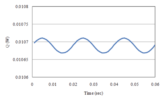 モデルは二次元モデルですので10,000ステップでも計算時間は大したことありませんが,三次元モデルとなると数値的な過渡を除くためだけに数万ステップも計算する必要があり、非現実的です。 そこで,PHICOILを用いたDC解析結果を初期値として、SUFCURを用いてDC+ACリスタート解析を行ってみます。 これはすぐ定常になると思われますが,確認のため50Hzで3周期計算します。 Fig.7に渦電流損グラフを示します。 AC成分はわずかなので,計算開始時からほぼ定常に達しています。