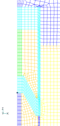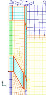 本改良機能を利用するためには、図1のように変形領域(水色)の要素をいくつかの要素(赤色で示したもので制御要素と呼びます)で囲む必要があります。制 御要素の節点は固定部と移動部の表面の節点に一致する必要があります。また、制御要素と元の要素が横切ることの無いようにしてください。