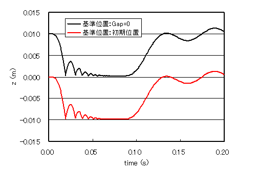 例として、"変形運動の改良"で示しましたプランジャーの解析データを示します。元のデータでは、基準位置をギャップがゼロの時として定義しております。試しに、初期値位置(ギャップが0.01mの位置)を基準位置と定義します。計算結果である位置変化はFig.2の赤線のようになり、ちょうど元の解析に対して、0.01mずれたものとなります。