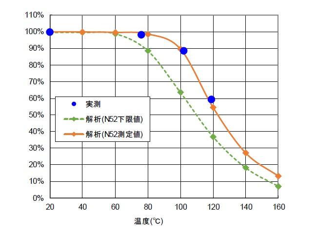 図7に無負荷誘起電圧の比率を示します。100%では減磁していないという意味になります。「実測」と比較すると,カタログ値を使用した「解析(N52下限値)」では早めに減磁が開始してしまい,「実測」との乖離が見られます。それに対し,測定値を使用した「解析(N52測定値)」は測定とほぼ一致する結果が得られていることがわかります。電磁鋼板の磁気特性も測定値を使用した方が実測と比較する際は合いやすいと言われておりますので,永久磁石の減磁曲線にも同様のことがいえるかと思います。