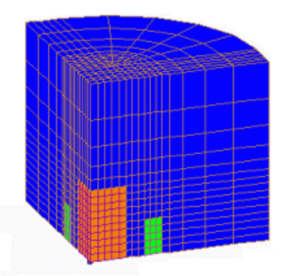 まず、Fig.1のように二次元メッシュを定義します。FEMAP入力の場合、物性番号としてFEMAPのProperty IDを用います。Fig.1の様に各領域にProperty IDを定義して下さい。このメッシュデータをファイルpre_geom2D.neuとしてEMSolutionへの入力データとします。z方向への拡張は、ファイル2D_to_3Dにより行います。上の二つのファイルと実行制御ファイルinputをを同じディレクトリに置き、EMSolutionを実行します。EMSolution実行画面で、実行メニューを選択しますとファイルダイアログが現れますので、input.1ファイルを選択して実行を開始してください。EMSolutionは、pre_geom2D.neuと2D_to_3Dをもとに、三次元メッシュ(Fig.2)を作製します。そのメッシュデータは、post_geomファイルに出力されます。もちろん、三次元メッシュを直接入力して計算を始めることもできます。ELMCURでソース電流を与えるためには、要素の向きをそろえておく必要があります。今の場合、電流は面3から入り面5から出る様に六面体要素を定義します。FEMAPにおいて、各Surfaceを定義する時に、第一番目のEdgeを電流が流入する面に来るようにしてください。