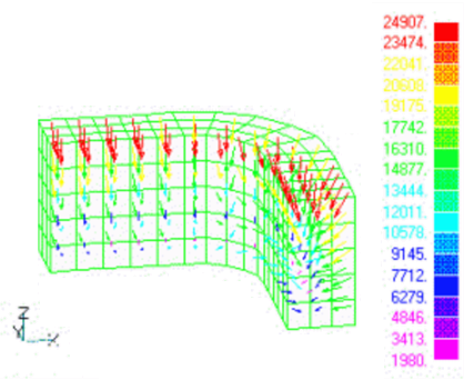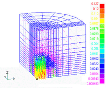 次に、リスタートにより電磁力を出力します。この場合は、ポスト処理プロセスのみを行えば済みます。再実行時には、outputファイル等出力ファイルが上書きされますので、必要な場合はファイル名の変更等を行っておいてください。まず、節点力分布を求めるため、inputファイルの一部を変更し(input.2)、同じディレクトリでEMSolutionを再実行します。outputファイルの電磁力出力部分をList.1に示します。これは、モデル部分1/8領域に働く鉄芯部とコイル部に働く各方向のトータル電磁力です。電磁力の分布はforceファイルに出力されます。Fig.5に、鉄芯部に加わる節点電磁力(単位N)を示します。透磁率が一定の部材には表面しか電磁力が現れません。同様に、コイル部に対してローレンツ力を求めます(input.3)。outputファイルの各物性毎の電磁力(List.1)をみると、上の節点力求めたコイルに働く電磁力とここで求めたものがほぼ一致します。この場合、電磁力分布は、force_J_Bファイルに出力されます。Fig.6にコイル部のローレンツ力分布($N/m^3$)を示します。