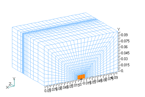 ここでは、導体が一方向に長く、それに直交して磁場が加わる場合の磁場解析を、二次元解析で近似する方法を述べます。 まず、三次元解析で、Fig.1の様な、分割モデルで三次元解析をする事を考えます。導体は、2cm×2cmの断面で、20cmの長さがあり、y方向に1Tの磁場が交流で加わるとします。導体は銅とし導電率を5.0×107S/mとし、加わる磁場は50Hzで変動するとします。三次元メッシュは、二次元メッシュを2D_to_3Dにz方向に拡張することにより作成しています。