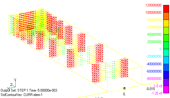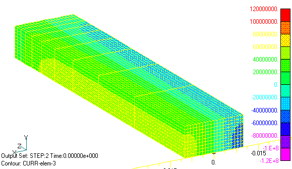 この問題で、3次元交流定常解析を行いますと、Fig.2の様な渦電流密度分布が得られます。Fig.3、4にz方向の電流密度分布を位相0および-90度にたいし、等高線で表します。これらの図からわかりますように、導体の端を除き、電流の分布はz方向にほぼ一様になっていることがわかります。このことから、x-y断面の二次元計算で良い近似が得られるであろうことが予想されます。 上の三次元解析で、要素数は12000に達しており、また、かなり細長い要素を使用しているためICCG法の収束もかなり悪くなっています。導体の表皮効果や、より複雑な断面形状を持つ導体を考えますと、二次元計算で解析できれば、解析効率は格段に向上します。