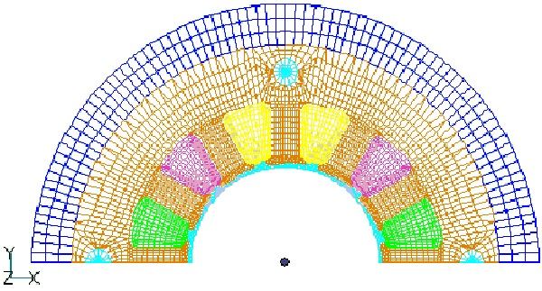 180度回転周期性の解析において,EMSolutionバージョンr10.2.4におきまして,エラー(ERROR in get_cyclic_edge)が発生し,実行が停止する場合があります。Fig.1は永久磁石モータのコギングトルク二次元元解析”の90度モデルを180度モデルに拡張したものですが,要素番号の付け方で,本エラーが発生します。Fig.2に周期面に接する要素の番号付けを示します。ここでは,エラーが発生するように,0度側の一部の要素番号を180度側の番号より大きいものとしています。