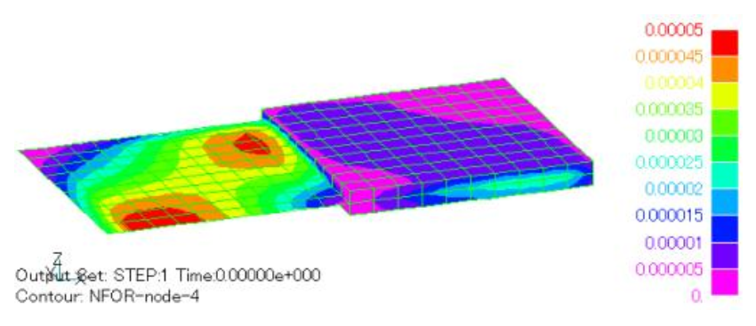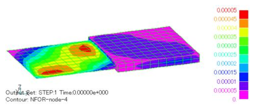 節点力の分布はFig.5、6のようになります。FORCE_NORDAL、FORCE_J_Bが1、2のどちらでも同じ出力で,出力は節点量で、単位は Nです。 Fig.5、6とは同じものを表しているのですが、見え方はかなり変わります。この理由は、上で説明しました求め方が異なることに起因します。節点力は節 点を共有する要素で分布力に節点形状関数をかけて積分していますので、節点を共有する要素数や要素の大きさに依存します。 電磁力密度が一定としますと、6面体の角の節点では要素力の1/8、稜線では1/4、表面では1/2の値になります(面要素では、四角形の角で1/4、辺 上で1/2)。 導体内部の節点で同じ値となります。