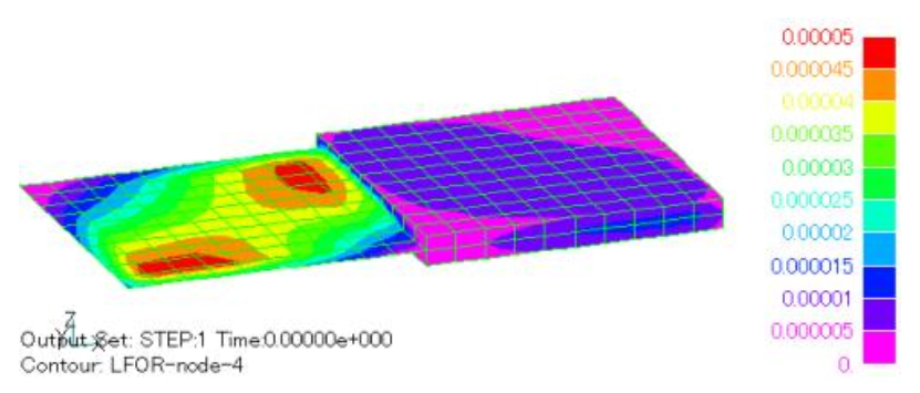 FORCE_NORDAL=1、FORCE_J_B=1としますと、要素量として要素力が出力されます。単位はNで各要素に働く電磁力となります。要素力の分布をFig.3、4に示します。 これは、Fig.1、2にそれぞれ各要素の体積をかけたものとなっています。薄板非磁性要素に対しては、代わりに面積と厚さがかけられます。 この場合、要素の体積がかかりますので、要素体積が異なりますと、Fig.1、2の電磁力密度の分布とは異なってきます。本例では、ソリッド側は2層になっていますので、面要素側の約半分の値になっています。