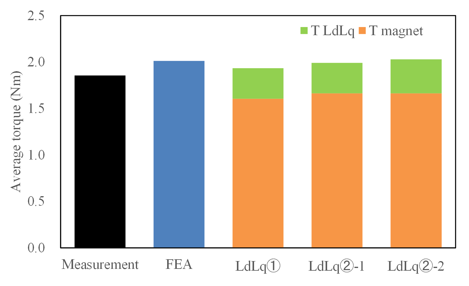 で求めたモータパラメータを用いて算出トルク式(1)より算出したトルク($L_{d}L_{q}$①),FEA結果(FEA)と実測結果(Measurement)と比較した平均トルクを図2に示します。これより,Frozen permeability法を用いて算出したものの方がFEA結果に近い結果が得られていることが確認できます。ただし,$\psi_{m}$のみを変更した場合($L_{d}L_{q}$②-1)はまだ差が大きく,$L_d$, $L_q$も変更した場合($L_{d}L_{q}$②-2)は,FEA結果と非常によく一致していますが,これはトルクの第一式のdq軸磁束を用いたものと等価となります。このように,トルクの成分分析も可能であることから,設計の改善指標として傾向を把握するのに有用な方法であると思われます。