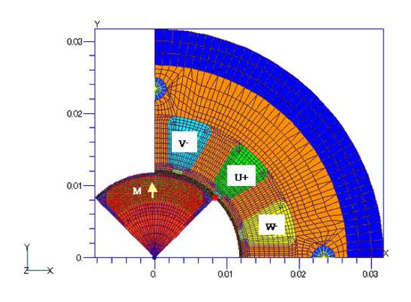 解析体系はFig.1に示す、"直流ブラシレスサーボモータのダイナミック解析(SWITCHの位置によるON-OFF機能)"と同様、"直流ブラシレスサーボモータの解析"で使用したもので、二次元非線形過渡解析とします。境界条件には4回反回転周期境界条件を設定します。計算条件は、SWICHによるON-OFF入力ではなく、"モータの巻き線へのCOILの適用例"のコイル条件を多少変更して電圧源として、30Turnのコイルを周波数100Hzの三相交流電圧源30Vrmsに繋いでロータの回転数を3,000rpmとします。