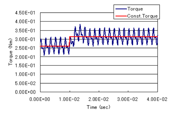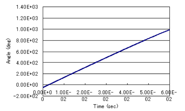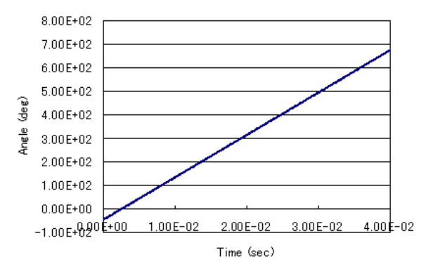 次に、この定常状態から運動連成解析を行い、ある時刻でインパクト負荷を与える解析を行います。定常状態として得た結果を初期値として、運動連成をRestart解析します。Restart解析は、時刻0から行うこともできます。ただし、端子電圧位相を合わせ、ロータの回転角度を運動方程式の初期角度として入力する必要があります。最初は定格トルクを与えて計算し、時刻10msec(機械角90度回転した時)で定格トルクの120%の外部負荷トルクを与えてどのような挙動が起こるかをみてみます。このとき、慣性モーメントを$2.e-4kgm^2$とします。なお運動連成解析を行うと、motionファイルに、時刻、位置(角度)、速度(角速度)、力(トルク)が出力されます。
