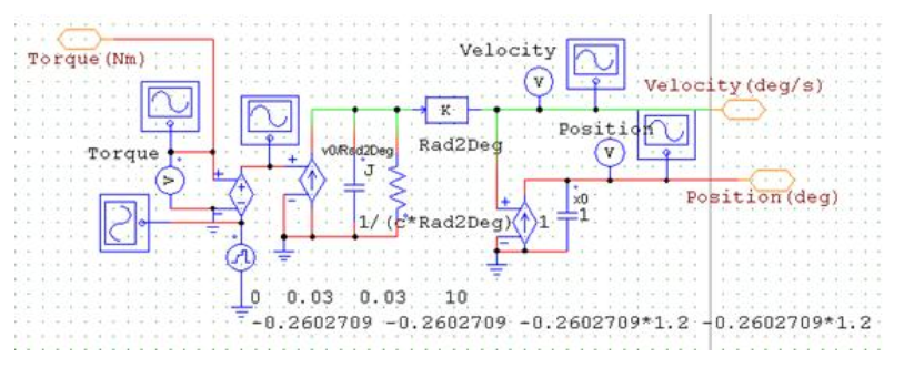 次に同じ解析を、PSIMとの連成解析機能 PSIM Couplerモジュールを使用して行ってみます。"シミュレーションツール PSIMとの連成解析"の項目3.2で使用したPSIM回路を少し変更したものをFig.6に示します。このときの運動方程式の等価回路をFig.7に示します。運動方程式のパラメータは、Subcircuitである運動方程式の等価回路の“Attribute”で設定します。この場合、EMSolutionのinputファイル中の運動方程式パラメータは無視されます。PSIMとの連成解析でも、EMSolutionの定常解を初期値として解析できます。Fig.7では、運動方程式をPSIMの等価回路として解いていましたが、EMSolution内部で運動方程式を解き、回転速度と位置を出力してPSIMに受け渡すこともできます。この場合のPSIM回路図をFig.8に示します。どちらの回路でも、機械角(deg/sec)を電気角(rad/sec)に変換する際に、まず初期ロータ位置-45度を電気角0度とするために45を足し、次に4極ですので、機械角を電気角に変換するために2倍しています。さらに、EMSolutionの定常計算でVuの初期位相角-120度を足し、deg/secからrad/secへの単位変換をしてdqo-abc変換ブロックの角度に引き渡しています。また、定常状態での電圧の振幅として、30Vrmsを、回転速度と速度指令との差をPI(比例積分)信号としてd軸成分として与えています。外部トルクは、最初に定常トルクを負荷トルクとして与え、10msecに定常トルクの120%を与えています。EMSolution中で運動連成した方が計算初期の変動が小さく済むようです。