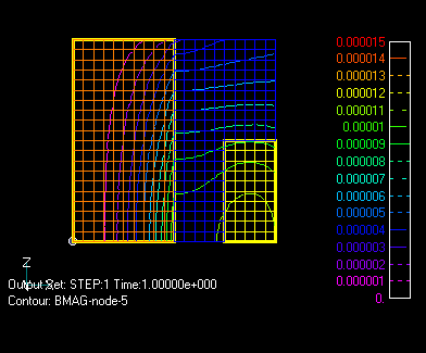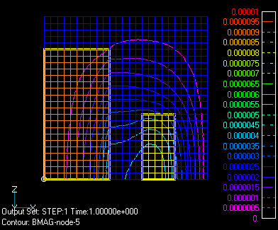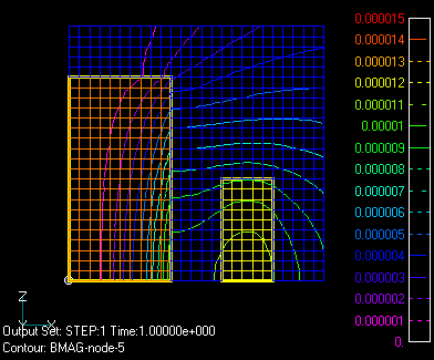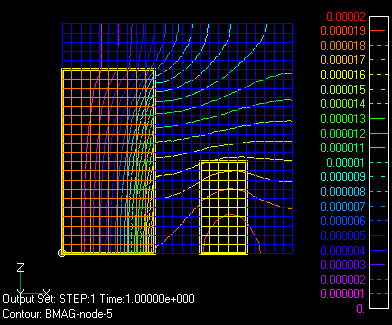 さて、同じメッシュで無限境界要素を用いた解析結果をFig.3に示します。これだけではわかりませんが妥当な磁束分布になっています。さらに外側のメッシュを取って、同じように計算した結果をFig.4に示します。Fig.4では、鉄コアおよびコイルの外面を境界としています。Fig.3とFig.4を比べますと、計算領域の磁束分布はほとんど同じになっています。このことは、無限境界要素により、開領域問題が妥当に解けていることを示し、精度的にも問題がないと考えられます。