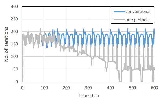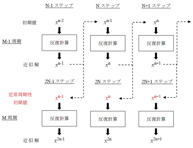 これは,例えば一周期性で考えた場合,M周期目のiステップ目の近似解はM-1周期目のiステップ目の近似解と一致することになります。しかしながら,従来の過渡解析では,一ステップ前の近似解を初期値として使用しているため,定常に達しているにも関わらず,同じ計算を繰り返していることになります。そこで,一周期もしくは半周期前の近似解を反復計算の初期値に用いれば,反復計算の残差が収束条件を満たしているため,余計な反復計算をせずに済むと予想されます。もしまだ定常に達していない場合でも,一周期前の近似解は定常周期解に近いことが予想されるため,反復計算時の初期残差を小さくすることができ,反復回数を削減,すなわち計算時間を短縮できると予想されます。この手順を示すと図2のようになります。