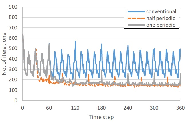 ICCG反復回数および非線形(NR)反復回数と計算時間の比較を表1に示します。half periodicおよびone periodicともに反復回数も計算時間もほぼ半分の56%となることがわかりました。