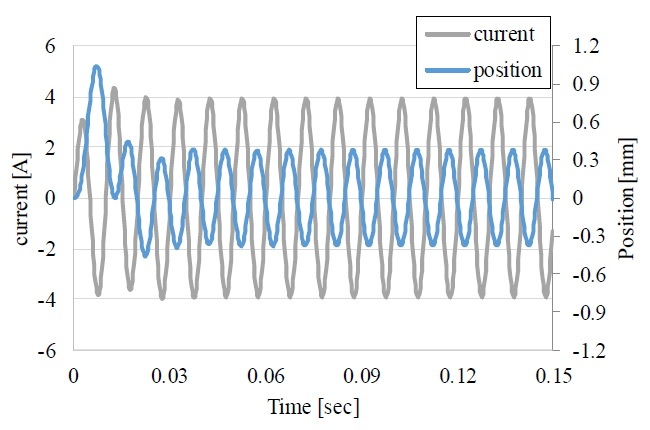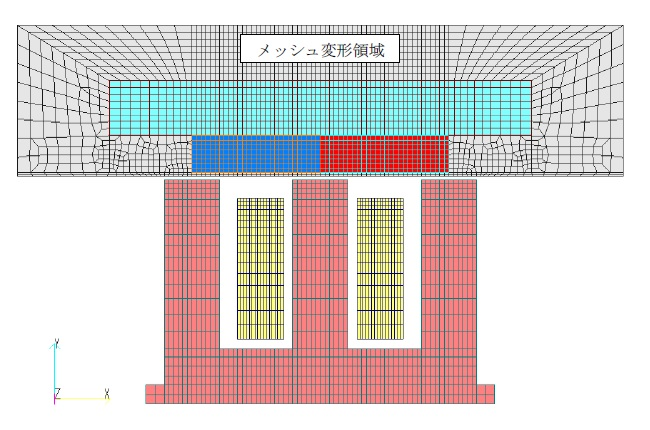 次に,始動解析への適用例として,リニアアクチュエータを用いて,静止状態から定常状態までの始動解析に本提案手法を適用し,反復回数の削減と定常状態が得られたかの判断基準になるかを示します。リニアアクチュエータの二次元解析モデルを図5に示します。アーマチャに磁性体と永久磁石が配置され,バネと接続され,磁性体コアにコイルが巻かれています。ここでは簡単のため100Hzの正弦波電圧源解析を行います。アーマチャを囲う領域をアーマチャの変位に伴い線形変形させ,運動方程式と連成解析を行っています。コアは非線形磁化特性とするため,運動方程式と共に非線形計算を行うことになります。一周期前の近似解と変位を初期値として使用しますが,一周期目は過渡状態が大きく出ることが予想されるため,二周期目から初期値として使用します。