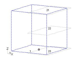 Fig.2のように面を定義します。面21,22,23は絶縁面です。面1はSUFCURのための電流流入面とします。面の方向は、面21は下向き、面23は上向きとします。面22と面1はどちらでも構いません。面21,23は対称境界面上にあり、面の正の向きは導体方向にする必要があります。ギャップ面は図のように導体から少なくとも一層はみ出して定義する必要があります。このモデルにより、導体の下面半分から電流が流入し、上面半分から流出するモデルとなります。 解析は交流解析とし、上下面の間に50Hzで1Vの電圧を印可します。これらをinputファイルとpre_geom.neuで定義します。
