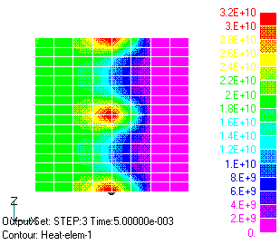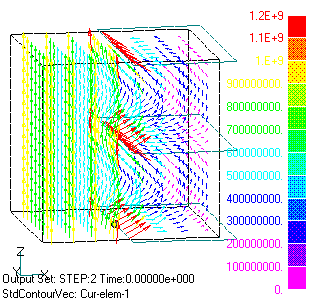 Fig.3に求められた電流分布を示します。電流は印可電圧により下から上に流れますが、ギャップにより遮られギャップを迂回して流れます。ギャップ先端部で電流密度が高くなります。Fig.4にheatファイルに出力される平均発熱分布を示します。ギャップ先端に発熱が集中します。また、Fig.5にローレンツ力より求めた電磁力分布(force_J_Bファイル)を示します。ギャップを開く力が働くことが解ります。精度を上げるにはギャップ先端部のメッシュをより細かくする必要があります。