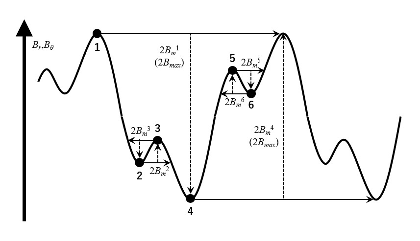 $$\displaystyle W_h = \frac{K_h D}{T} \sum_{i=1}^{N_E} \frac{\Delta V^i}{2} \Biggl( \sum_{j=1}^{N_{px}^i} ( B_{mx}^{ij} )^2 + \sum_{j=1}^{N_{py}^i} ( B_{my}^{ij} )^2 + \sum_{j=1}^{N_{pz}^i} ( B_{mz}^{ij} )^2 \Biggr)\tag{6}$$ここで、$N_E$は鉄心領域中の要素数、$N_{px}^i$、$N_{py}^i$、$N_{pz}^i$はi 番目の有限要素における磁束密度の各成分の時間変化に対する極大・極小値の個数、$B_{mx}^{ij}$ 、$B_{my}^{ij}$、$B_{mz}^{ij}$はメジャーおよびマイナーループの振幅であり、Fig.1に示すような方法で、磁束密度波形の全極大・極小値より決定しています。その際、あるループにおける磁束密度の振幅の2乗が2回加算されるため、加算後に2で割っています。これは、メジャーループとマイナーループのヒステリシス損を同一のアルゴリズムで求めています。