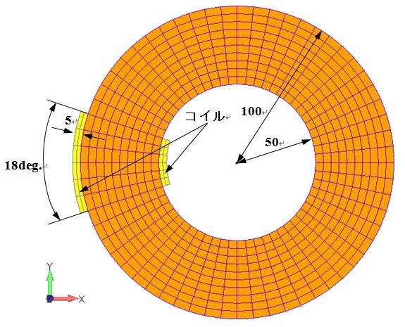 図1に示すリングモデルで,二次元静磁界のヒステリシス解析を行います。リングモデルでは反磁界が小さく,磁気特性の特徴が顕著に現れます。最初に消磁状態とした磁性体リングにコイル電流を流し,磁性体の磁束密度を求めます。コイル電流は線形にゼロから最大値まで増加させ,その後,ゼロまで減少させます。
