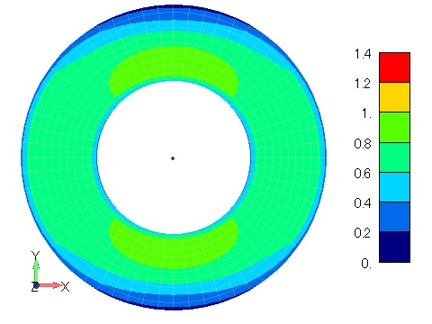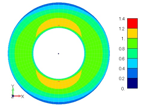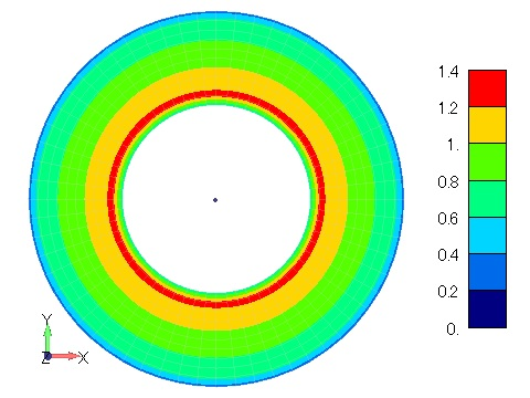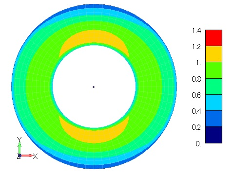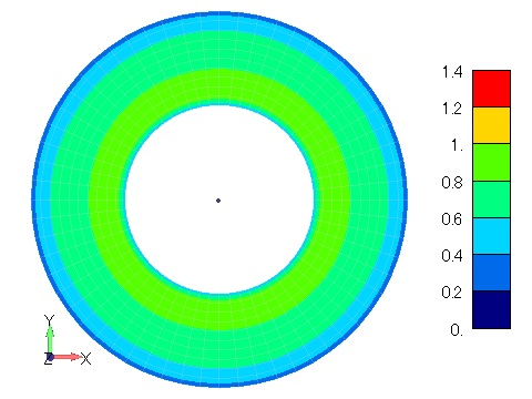 図2に磁気特性が等方性ヒステリシスの場合の磁束密度分布の時間変化を示します。磁束密度分布は同心円状で周方向に一定であり,等方性を確認することができます。ヒステリシス解析であるため残留磁化の影響により,コイル電流上昇時と下降時では振る舞いが異なり,コイル電流ゼロとなる(d)10sの時点でも残留磁束が見られます。本解析の過程は,着磁,消磁過程に相当し,本ヒステリシスモデルが磁石特性に同定できれば,磁石の着磁および消磁過程を模擬できるのではと考えます。次に図3にX方向を圧延方向とした異方性ヒステリシスの場合の磁束密度分布を示します。X方向とY方向で磁束密度分布の偏りが見られます。