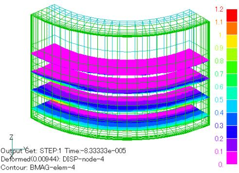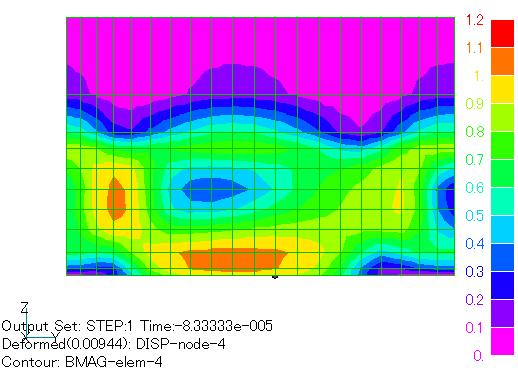 9000rpm回転時の渦電流表皮深さは 0.15mm程度と評価されます。表面層の分割厚みを0.03mmとしました。このような薄い要素層を用いて解析しますと、非対称行列ソルバの収束が非常に遅くなります。この例ではILUBi-CGSTAB法を用いましたが、10 -8までの収束を得るのに、非線形繰り返しを含め繰返し数は39000回程度になりました。