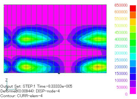 図5、6に渦電流の分布を示します。渦電流は軸の表面に流れています。導電性の異方性のため、電流方向はほとんど水平面内となっています。大まかには、導体表面の磁場変動を少なくする方向に流れています。
