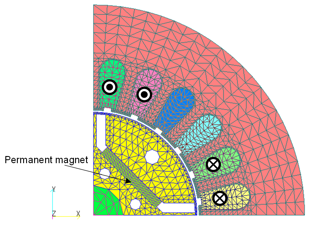 解析事例として,図1に示す電気学会ベンチマークモデル「Dモデル」を用います。着磁解析のため図の位置でロータを固定してコイルに直流通電することを考えます。コイル電流の作る磁界はロータ外向きにN極の永久磁石に着磁することになります。
