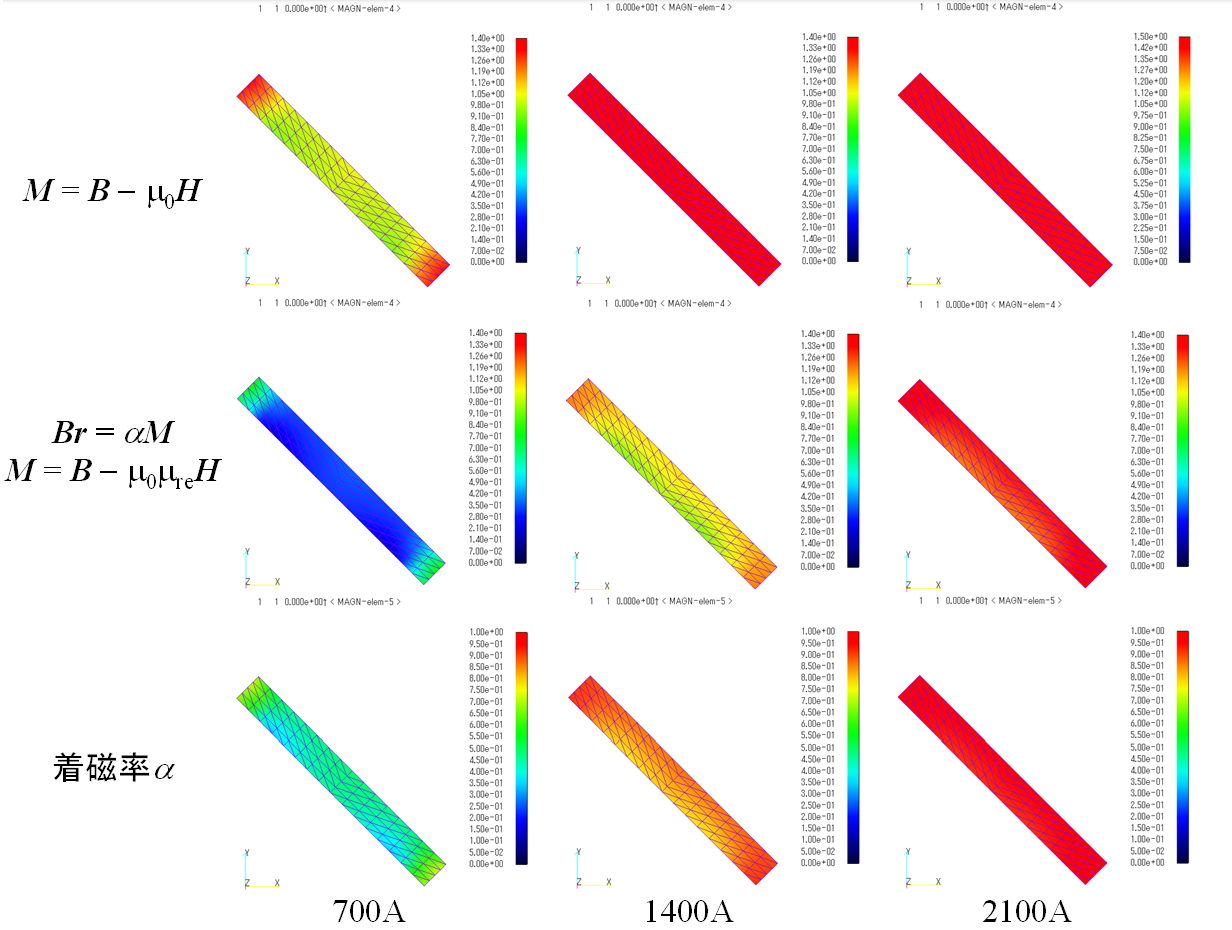 着磁電流を700A, 1400A, 2100Aとして着磁曲線と着磁率曲線を用いた着磁解析を行います。本機能は現状静磁界解析のみに対応していますので,着磁電流を通電させた静磁界解析結果を図2に示します。上段が通常の非線形解析で磁化$M$を算出した磁化分布,中段が着磁率とリコイル透磁率を考慮して残留磁束密度$B_{r}$を算出した磁束密度分布,下段が中段の解析で得られた着磁率分布です。着磁電流を上げていくと着磁率が上がっていき,2100Aでは着磁率はほぼ1になっていることが確認できます。単純に着磁率1となる着磁曲線からリコイル透磁率で残留磁束密度を算出するとおよそ1.37Tとなりますので,1400Aではまだ着磁が不十分であり,2100A程度ないと十分に着磁できないと思われます。なお,着磁電流が低い場合に磁石両端の磁化および残留磁束密度が大きいのは,フラックスバリアによるためです。