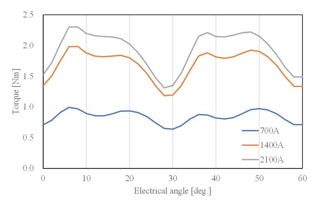 次に,定格条件である3Arms, $\beta$=25degの初期磁化分布として,先の解析で求めた残留磁束密度分布を入力した解析を行います。図3にトルク波形を示します。着磁電流が大きくなるとトルクも上がっていることが確認できます。