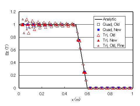 今回の改良を施しますと、Fig.6, Tri, Newで示しますように、中心軸付近の分布が滑らかで精度の良いものになっています。メッシュが規則正しいこともありますが、5桁以上の精度で理論解と一致しています。電流が流れているコイルの部分では、磁場は線形に変化するはずですが、線形三角形要素ですとそれを表現することができず、今回の改良の有無に関わらず、階段状の分布となっています。