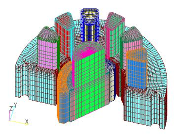 Fig.1に、ELMCUR、COILのGCE(ARCも使用。以下GCEモデルと表記)とFGCE(FARCも使用。以下FGCEモデルと表記)を適用した解析メッシュをそれぞれ示します。なお、ELMCURモデルとPHICOILモデルは同じメッシュを使用しています。解析メッシュはモデルの対称性より、角度方向、軸方向共に1/2の1/4モデルです。ここで、ELMCUR、PHICOILは対称性を考慮して、解析領域内のコイルのみメッシュ分割しています。ELMCUR、PHICOILではコイルを有限要素メッシュで作成しなくてはならないため、ここではコイルエンドを無視しています。Fig.1のように作成した場合、コイル電流はZ軸方向に流れますが、Z軸の境界下面から上面までコイルを作成しています。これは、上下面の境界条件をBn=0として、電流密度の連続の式