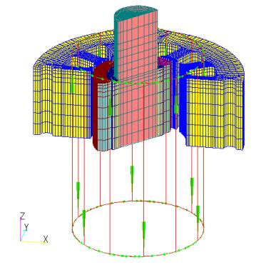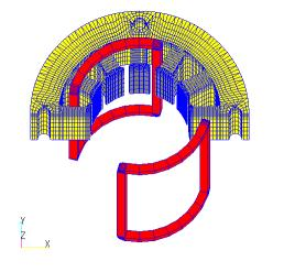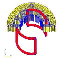 COILはロータやステータのメッシュ分割とは独立に定義することができるため、巻き線を簡便にモデル化できます。例として、永久磁石モータのコギングトルク二次元解析の90度1/4反対称二次元モデルを、見やすくするために180度対称二次元モデルととして積み上げにより三次元に拡張し、三相交流を与えたモデルを使用します。磁場ソースとして、比較基準となる磁場ソースELMCUR、COILのブロック電流要素であるGCEと線電流要素であるFGCEをコイルに適用して解析した例を示します。また、通常バルクの導体に電流を流す場合に使用されるPHICOILについても示します。