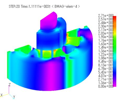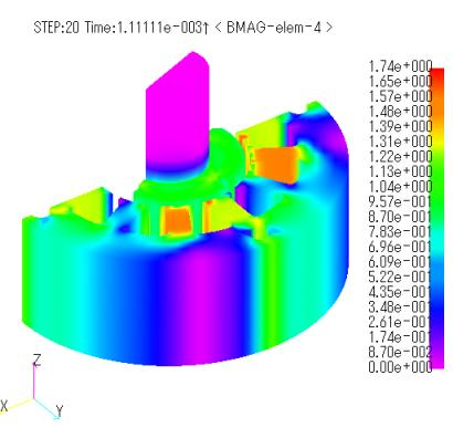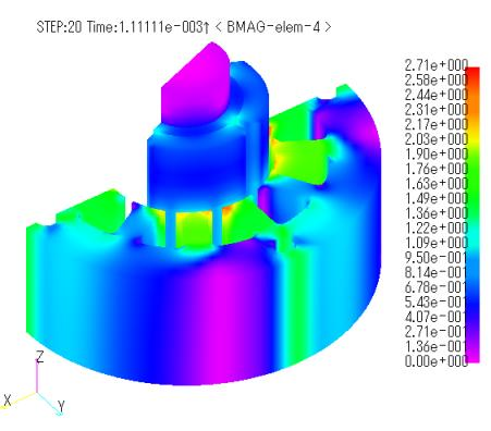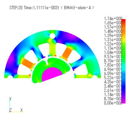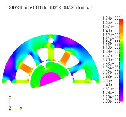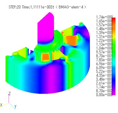 解析結果として、Fig.8、9にそれぞれの磁束密度分布図、磁石の渦電流ベクトル分布図を示します。最大磁束密度はステータのオーバーハングしているス ロット部分で2.7Tと非常に高くなっています。これは、オーバーハングの影響によるものだと考えられます。一見するとELMCUR、FGCEモデルと FGCE_farモデルの結果に違いは無いように思えます。