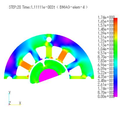 解析条件は、30Turnのコイルに周波数100Hzの三相交流をそれぞれ実効値2A与え、ロータの回転数を3,000rpmとします。ロータ、ステータ は積層鉄心とし、渦電流は考慮しないものとします。永久磁石の磁化は1.2T、磁石の渦電流損は計算するために導電率6.944´105S/mを与えています。