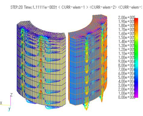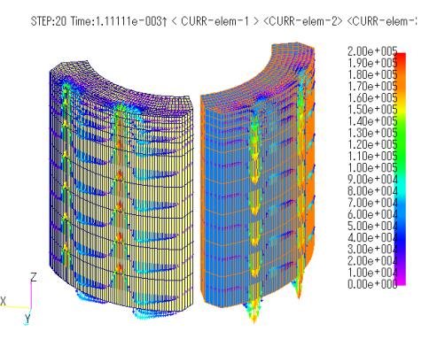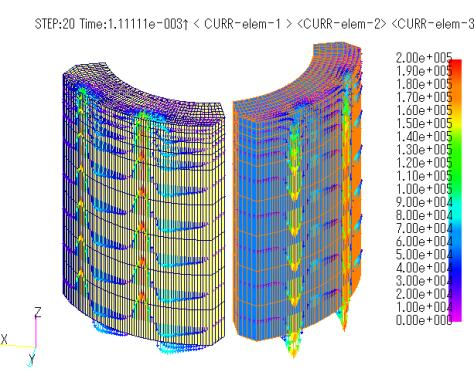 Fig.3にELMCUR、FGCE、FGCE_farの各モデルで得られた磁束密度分布を、Fig.4にそれらの磁石の渦電流ベクトル分布を示します。 どの磁場ソースでも同じ分布が得られ、磁場ソースによる差は見られません。磁石はバルクとして計算しているため、大きな渦電流ループができています。渦電 流は時間変化を追ってもその位置は変わらずステータスロットの箇所で大きく、その幅でループになっている様子がわかります。なお、PHICOILは曲がり や角があると電流が内側によりますが、今回のモデルではエンドコイルを無視して直線的に流れるため電流の偏りは起きず、ELMCURと同等にコイル断面に 均等な電流分布となります。